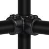 4-Weg kruisstuk. 4-weg klem om verticale stijlen te koppelen aan 4 horizontale buizen die haaks op elkaar staan. De verticale buis loopt door de klem.